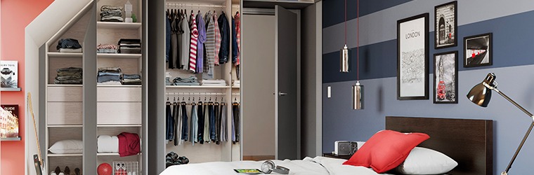 Si no dispones de mucho espacio delante del armario, tu mejor elección son las puertas correderas pero, si por el contrario dispones de espacio suficiente delante del armario, puedes optar por puertas abatibles que te permitirán ver el interior del mueble perfectamente.