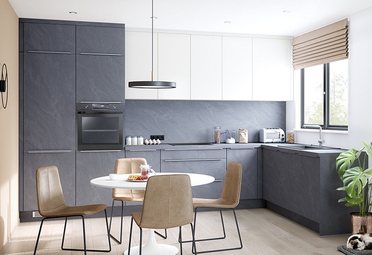 Los armarios blancos con detalles de acero inoxidable darán un toque moderno, mientras que los armarios grises con un toque de color para los botones o tiradores aportarán un toque único. Una encimera blanca con detalles grises en los muebles y los electrodomésticos también harán que tu cocina destaque.