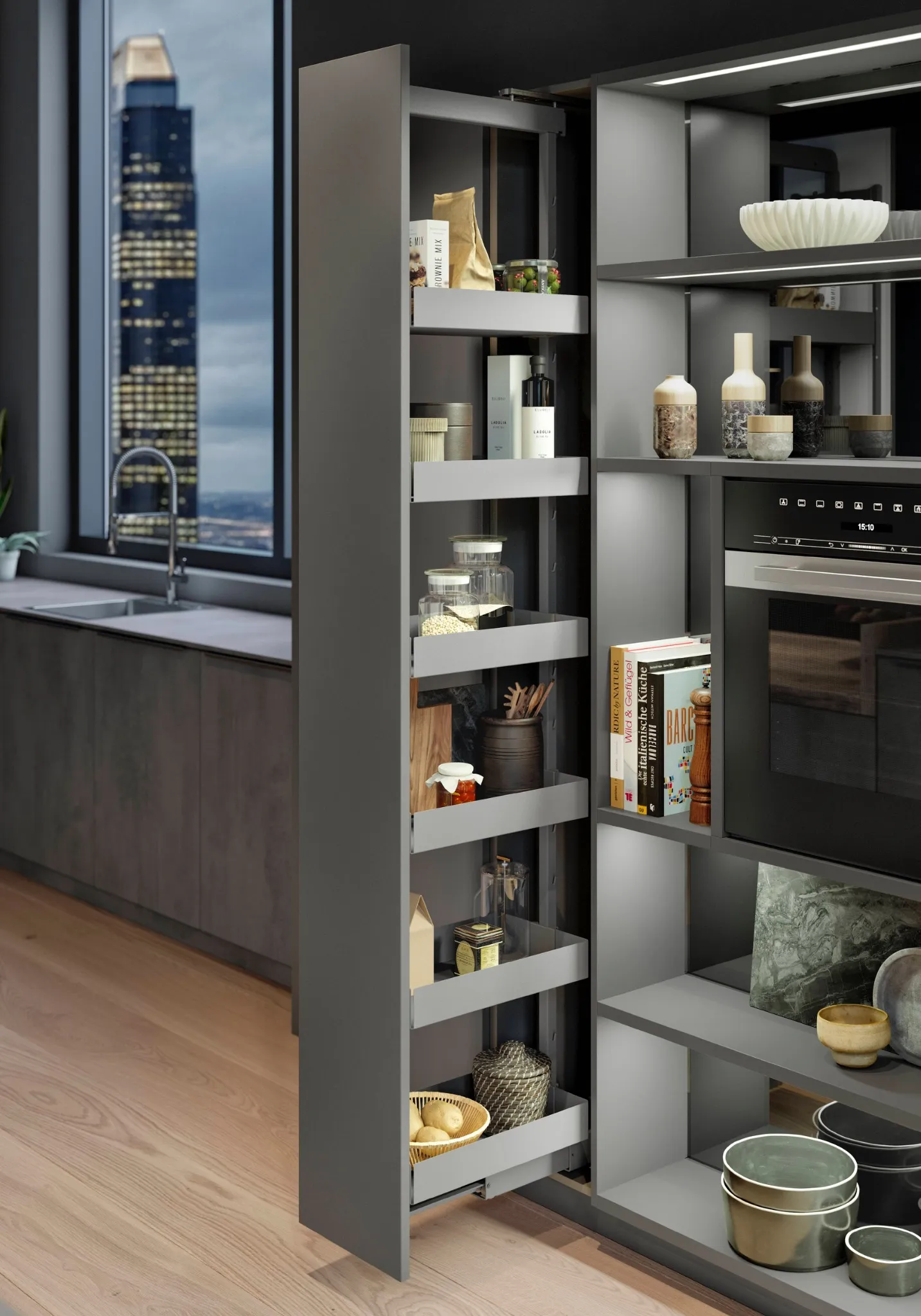 Los muebles columna de cocina permiten utilizar la altura de forma eficiente. Pueden servir como despensa, con estantes regulables o cajones, o como espacio para integrar hornos, cafeteras, vinoteca, etc.