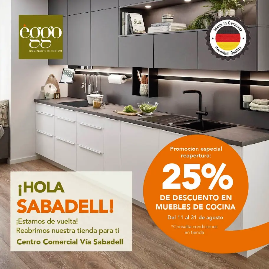 Para celebrar la vuelta de éggo Cocinas a Sabadell, del 11 al 31 de agosto podrás disfrutar de un 25% de descuento en todos nuestros muebles de cocina. Es la oportunidad perfecta para dar el paso y renovar tu espacio con diseños a medida, materiales de primera calidad y la tecnología alemana que nos caracteriza. Ven a conocer nuestra nueva tienda, inspírate con nuestra exposición y deja que nuestros asesores te ayuden a crear la cocina de tus sueños al mejor precio.